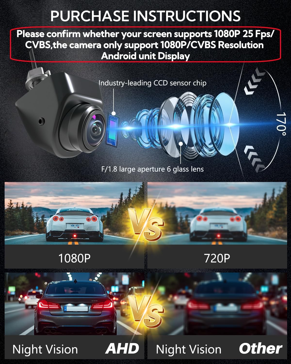 【Support AHD, CVBS, High Compatibility 】The reverse camera compatible for Most of RCA video port, head units, monitorsm Android DVD system etc. Does Not Work with Any Dash Cam, GPS, DVR, Carplay Screen. Simply cut the blue wire in the event of a power failure to switch between AHD 1080P 25fps/CVBS signal modes, suitable for most types of DC 12V vehicles of different lengths. The rear camera uses pure copper shielded cable which enhances the signal stability during long-distance transmission