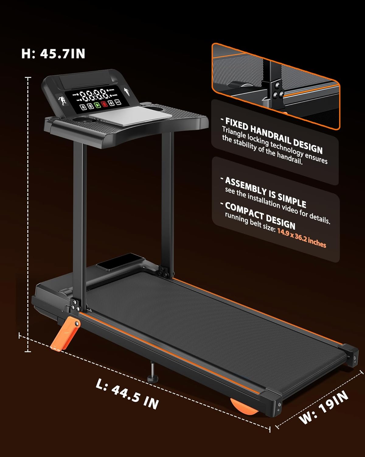 ***【Upgrade 4 – Control Way from bar button to Bigger Console】 The convenient console with a Big LED Display is perfect for seniors, and it features speed+/-, incline+/-, start/stop, and a 4/8MPH shortcut button for easy execution of your training plans. Furthermore, the console folds back 45° to be flush with your desk, further expanding your workspace
