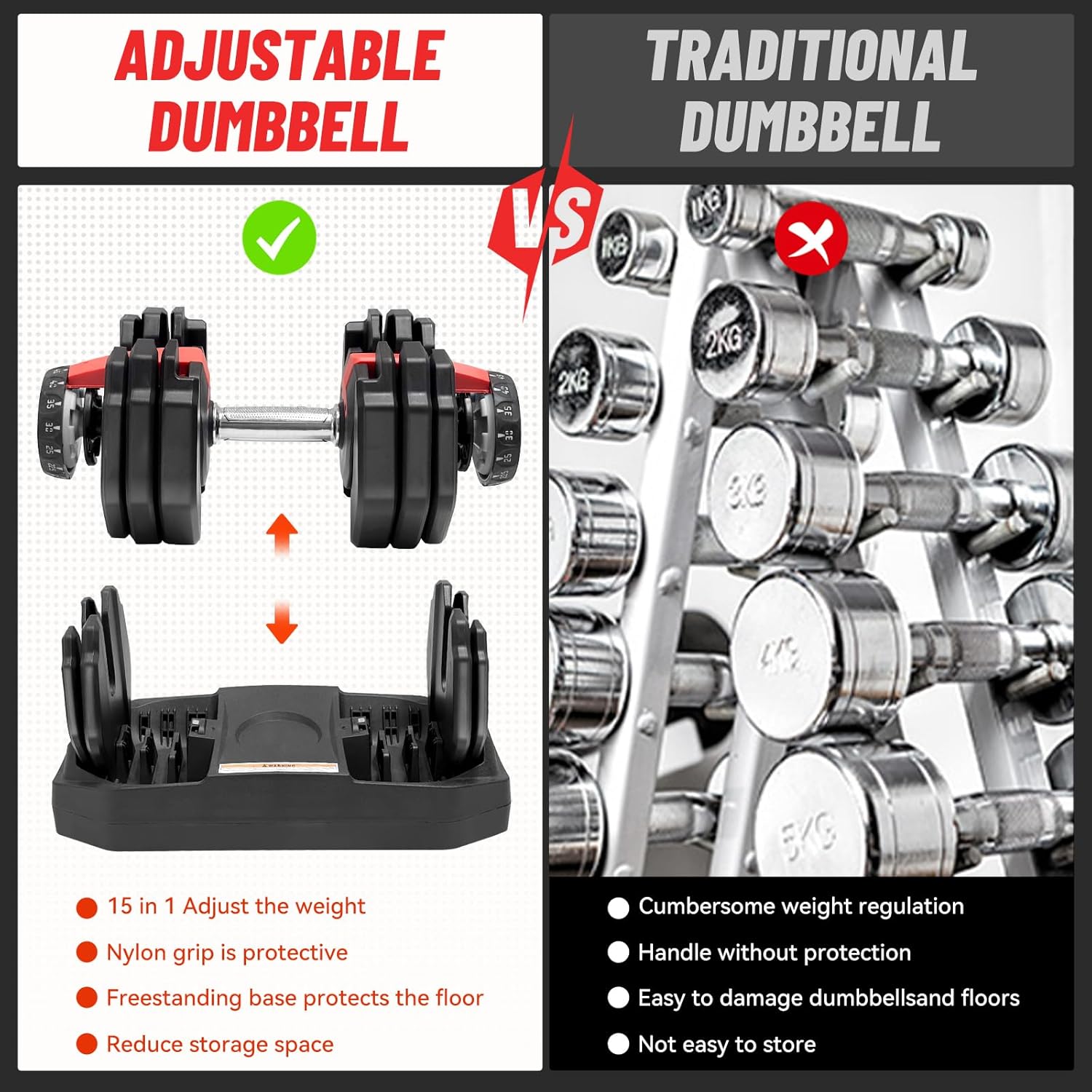 【Space-Saving Design】 Transform your home gym with our space-efficient adjustable dumbbell. By combining multiple weight sets into one compact design, you can save up to 80% of storage space. Its sleek storage tray securely holds the dumbbell when not in use, keeping your workout area tidy and organized while eliminating clutter.