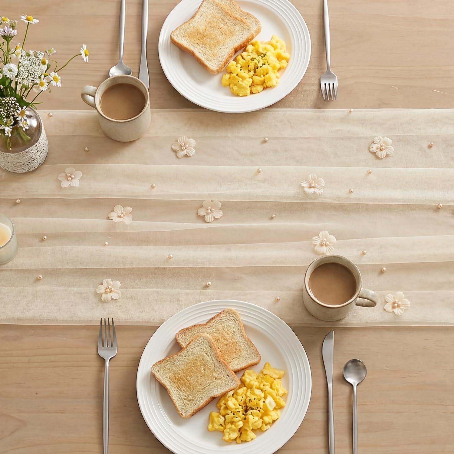 Artoid Mode Flower Pearl Champagne Gauze Table Runner 10FT, Seasonal Sheer Dining Holiday Wedding Birthday Baby Shower Table Decor for Home Party