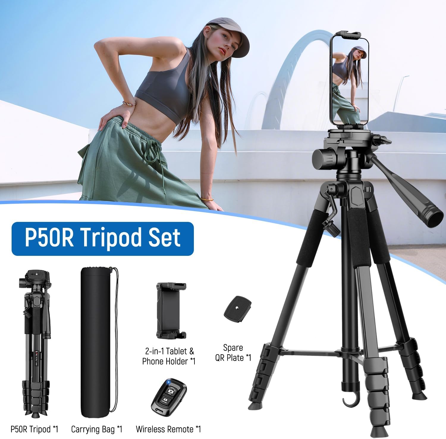 【 Camera Tripod for Phone and Tablet】Victiv P50R camera tripod comes with a 2-in-1 Phone & Tablet Holder, it can easily accommodate both your tablet and phone, providing convenience for various usage scenarios. Whether you want to use your tablet for watching videos or your phone for taking quick photos, it has you covered. Additionally, ipad tripod is equipped with wireless remote, allowing for more flexible operation and control