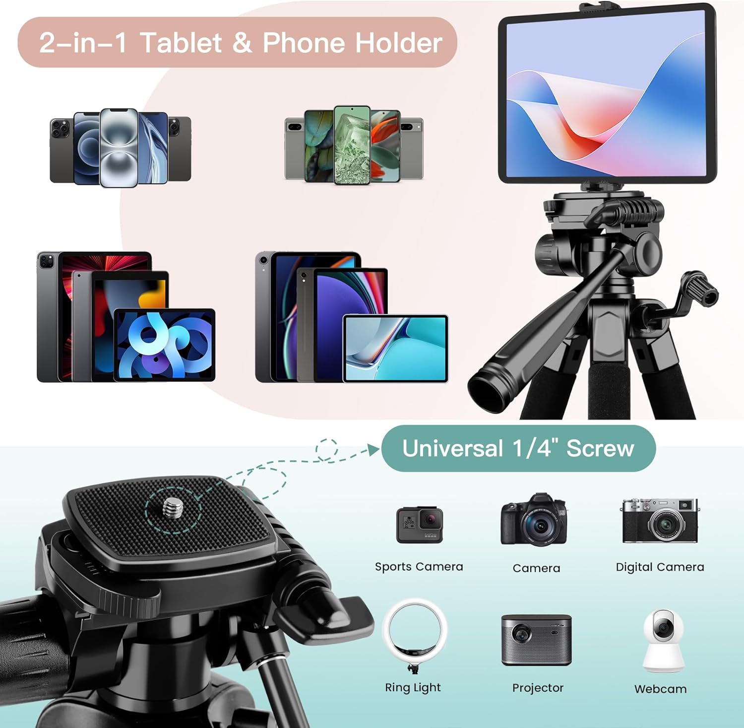 【Tripod for Tablet with 3-Way Pan Head】Tablet tripod’s pan head allows for 360-degree horizontal rotation, enabling you to capture panoramic views with ease. Tripod for iPad also supports both upward and downward tilting, making it suitable for various shooting angles.