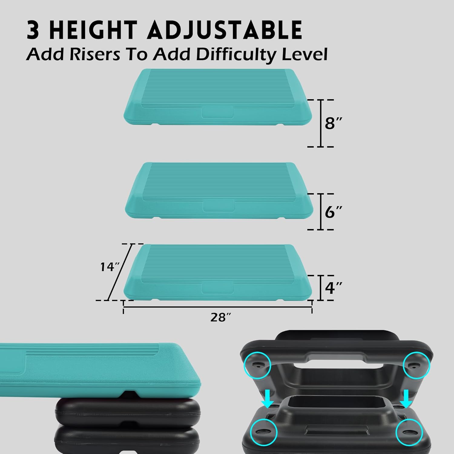 Adjustable Fitness Levels: 28”x14” compact aerobic platform with 4 risers easily switch height between 4″, 6″, and 8″, allowing for customized workout intensity and progression, suitable for beginners and pros.