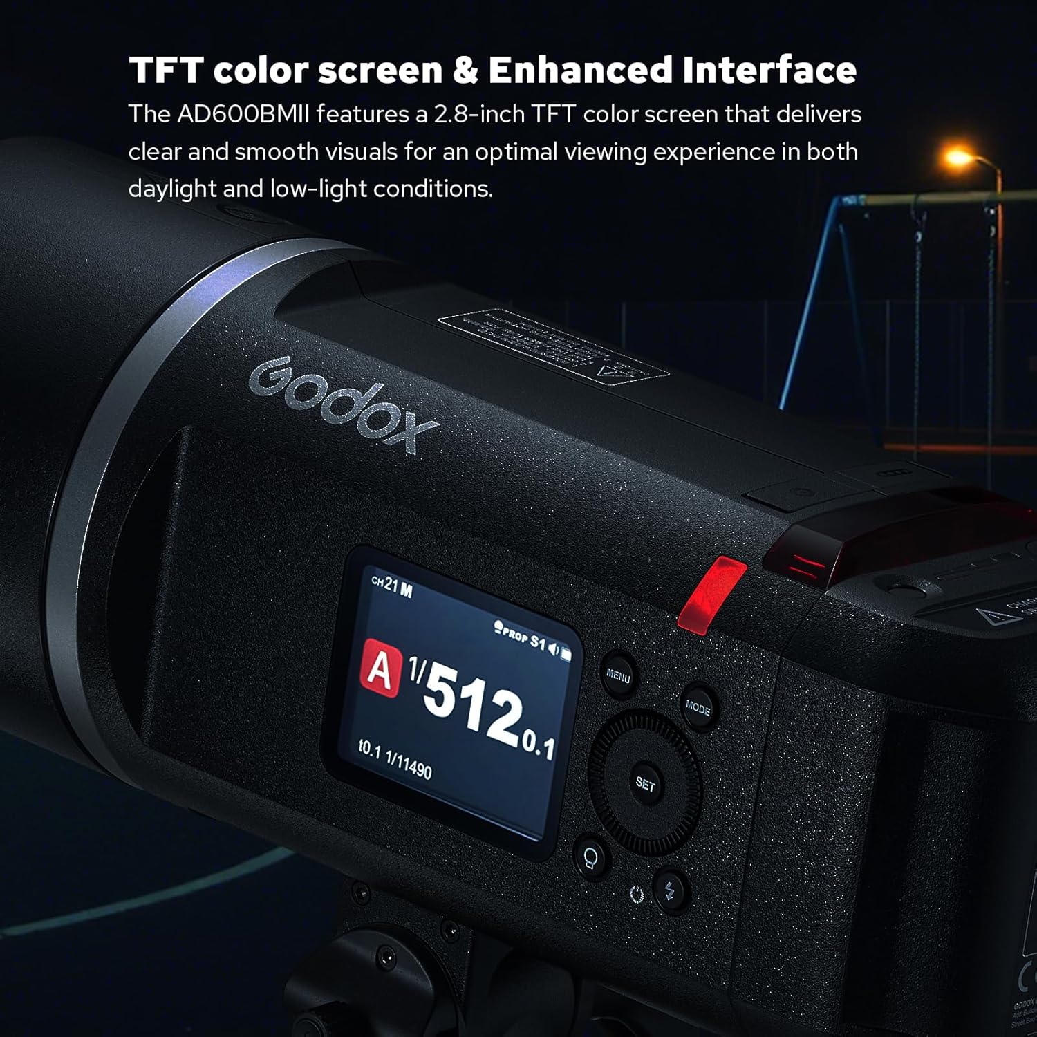 [User-Friendly Interface and Precise Power Control]: The 2.8-inch TFT color screen and upgraded interactive menu of the AD600BMII make operation intuitive. With a one-touch modeling lamp button and a power range from 1/1 to 1/512 (adjustable in 0.1 increments), it caters to various shooting scenarios with fine-tuned lighting control.