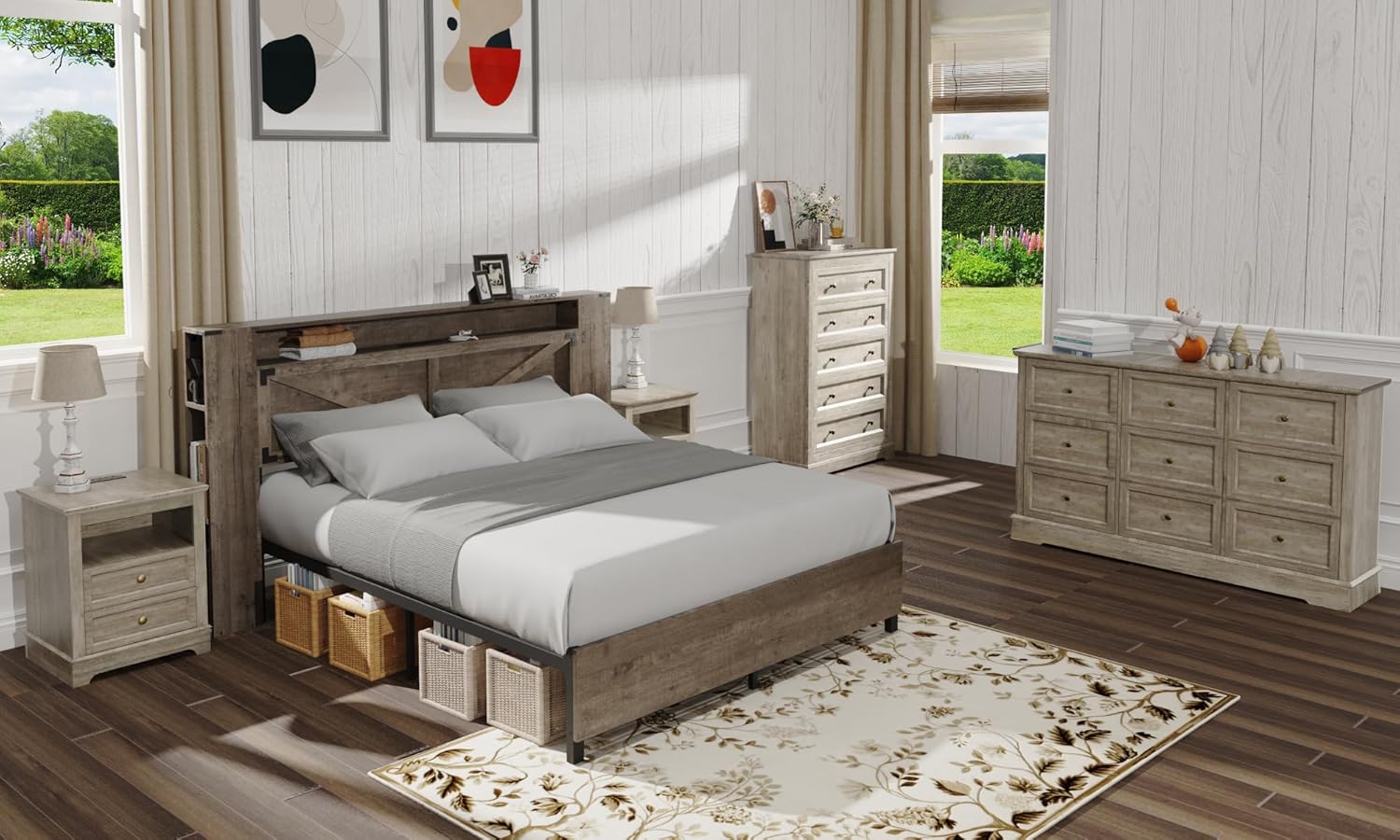 LOUVIXA Farmhouse Bedroom Sets of 4, 4Pcs Farmhouse Dresser Set,Including 9 Drawer Dresser, 5 Drawer Dressers and Nightstand Set of 2 with Charging Station (Grey Sets, 4 Pieces)