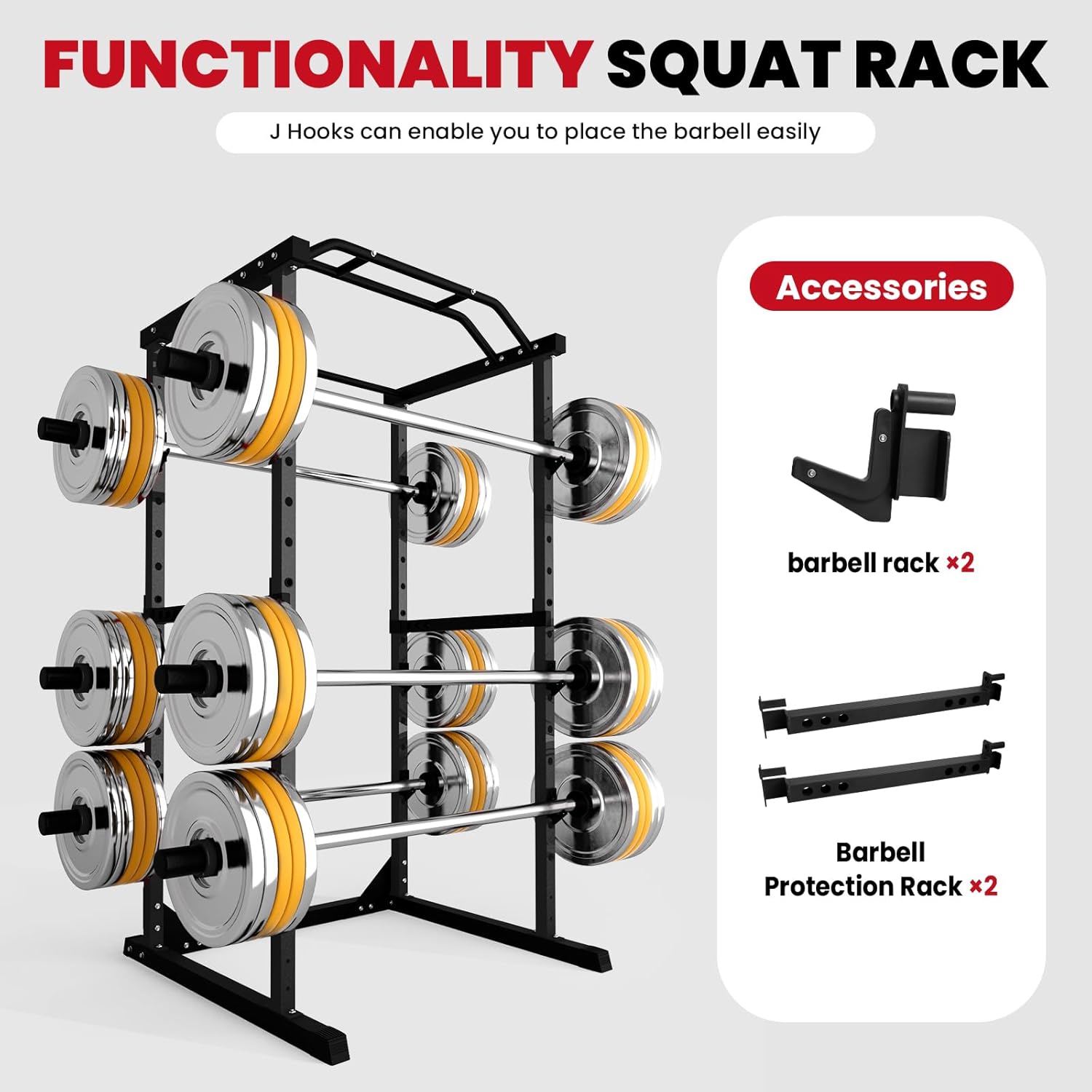 [14 Adjustable Positions]:14 levels adjustable settings for J hooks and spotter arms to customize all kinds of posture needs. You can quickly change the movement of your squat and bench press by simply adjusting the position of the jaws and safety bar.