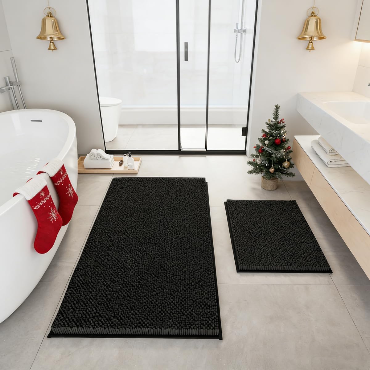 RUN HELIX Bathroom Rugs Set 2 Piece Thick Chenille Bath Mats, Soft Quick Dry Plush Absorbent Bath Rugs with Non-Slip PVC Backing, 32×20+24×16 Inch Black