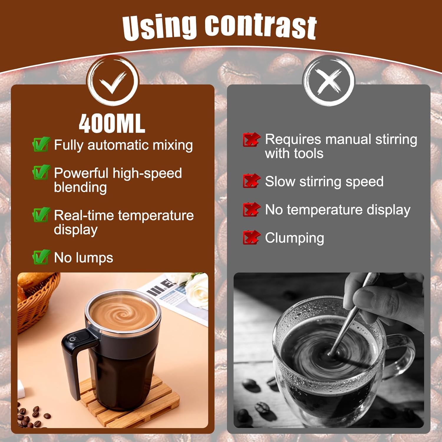 SELF STIRRING COFFEE MUG: Simply double-click the button on the handle to blend coffee, protein powder, or oatmeal to a perfectly smooth texture in seconds, easily removing lumps and saving you the time and wrist strain of manual stirring.