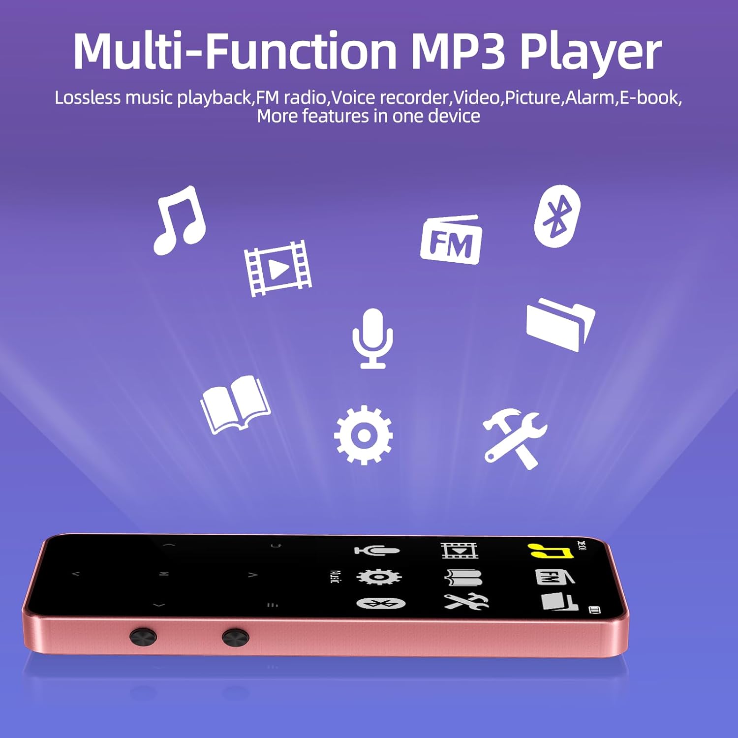 Enjoy crystal-clear sound with this Hi-Fi MP3 player, supporting MP3, WMA, APE, FLAC, WAV, AAC-LC, and M4A. Seven EQ modes let you customize music anywhere. Perfect as a portable music player, bluetooth MP3 player, or MP3 music player