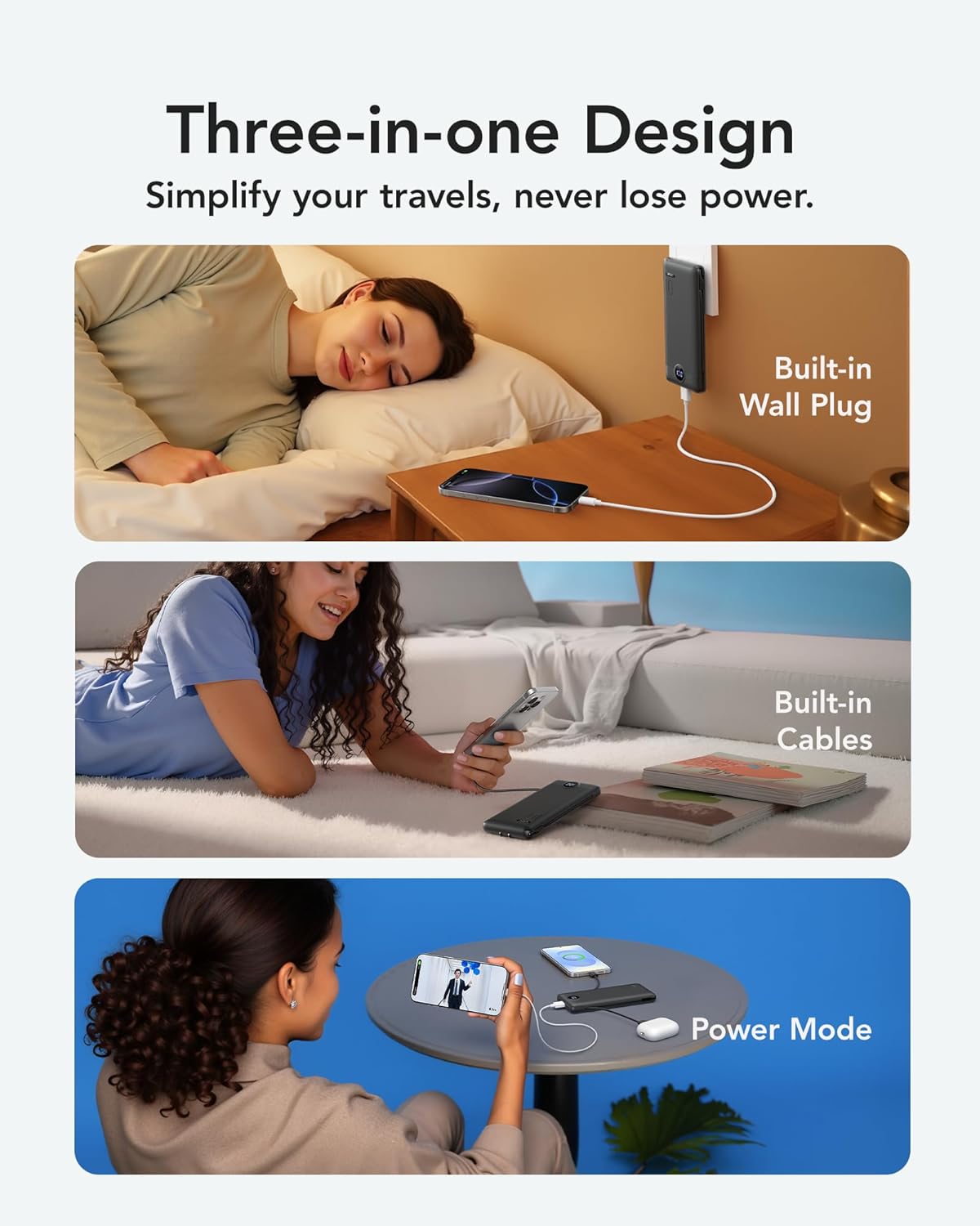 [Portable Charger With Built-in AC Wall Plug] This portable charger not only features built-in Micro, USB-C, and for iPhone charging cables but also includes USB and USB-C ports for added versatility. Moreover, the portable phone charger incorporates a built-in wall plug, enabling direct charging of the power bank from a wall outlet.